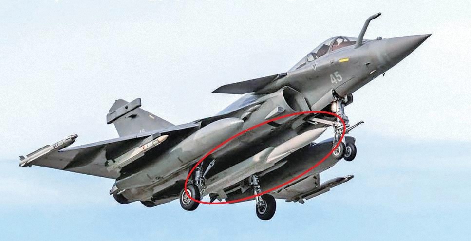 法國(guó)“陣風(fēng)M”戰(zhàn)斗機(jī)機(jī)腹下掛載新型超聲速核導(dǎo)彈ASMPA-R(圖中紅圈內(nèi))。