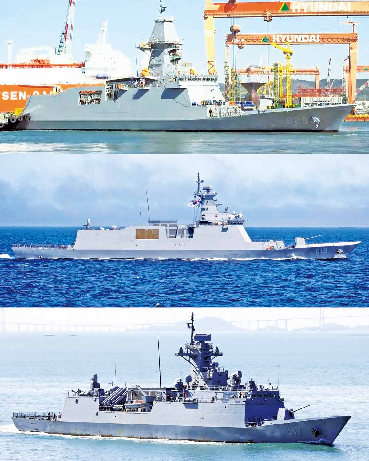 從上至下依次為:FFX-Ⅲ級首艦“忠南”號、FFX-Ⅱ級首艦“大邱”號和FFX-Ⅰ級首艦“仁川”號。