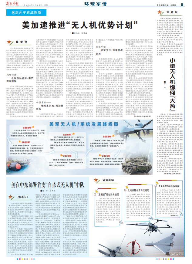多管齊下全面鋪開。美國國防部要求各軍種都要設(shè)立無人機(jī)資源管理項(xiàng)目辦公室,歐洲地區(qū)和印太地區(qū)同步設(shè)立專項(xiàng)工作組,加速推進(jìn)無人機(jī)部署和運(yùn)用。其中,美陸軍計(jì)劃為每個(gè)作戰(zhàn)師配備約1000架無人機(jī),2026年底前完成所有現(xiàn)役師列裝,并授權(quán)營(yíng)、連級(jí)指揮官直接調(diào)用。美海軍陸戰(zhàn)隊(duì)宣布采購1萬架定制版小型無人機(jī),以優(yōu)化作戰(zhàn)編組并增強(qiáng)滲透隱蔽性。美空軍無人機(jī)發(fā)展轉(zhuǎn)向“高低搭配”,在推進(jìn)高端隱身協(xié)同作戰(zhàn)無人機(jī)研發(fā)的同時(shí),注重中小型無人機(jī)的低成本化發(fā)展。