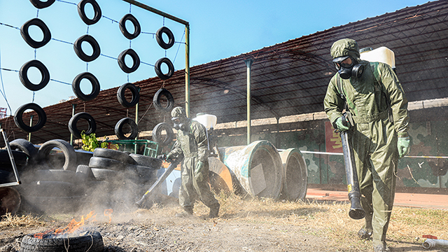 2015年2月18日,在塞拉利昂弗里敦市郊的中塞友好醫(yī)院埃博拉留觀診療中心,中國(guó)人民解放軍302醫(yī)院援塞醫(yī)療隊(duì)隊(duì)員們進(jìn)入埃博拉病房查房,發(fā)放藥品。