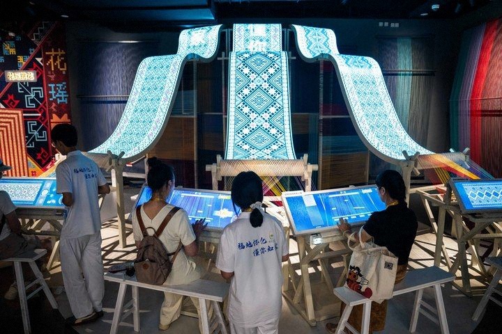 2025年9月16日,游客在湖南省懷化市五溪非遺園體驗數(shù)字化織錦。五溪非遺園位于湖南省懷化市鶴城區(qū),于2025年5月正式開園。園區(qū)包含非遺廣場、數(shù)字體驗空間和研學(xué)工坊三大板塊,運用VR、AR、全息投影等技術(shù)打造42個沉浸式非遺體驗項目,吸引更多人了解、學(xué)習(xí)非遺,讓傳統(tǒng)技藝成為城市發(fā)展的文化動力。