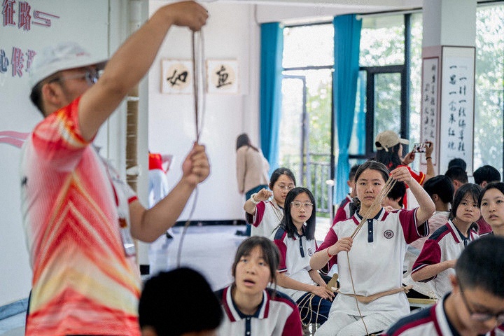 2025年5月12日,云南省昭通市威信縣第一中學(xué)學(xué)生在大屏上紅色研學(xué)實踐基地體驗編織草鞋。200余名學(xué)生在紅色研學(xué)實踐基地親手編織草鞋、制作蠟染,并參觀了扎西會議舊址、紅軍長征過云南情景體驗館,在實踐互動中重溫紅色革命歷史。威信縣立足紅色文化資源優(yōu)勢,先后建成扎西會議紀(jì)念館、紅軍長征標(biāo)語館等紅色文化展館,以舊址遺跡為“教室”,以文物史料為“教材”,設(shè)計開發(fā)多門精品研學(xué)課程和線路,在深入開展紅色研學(xué)系列活動中傳承紅色基因。