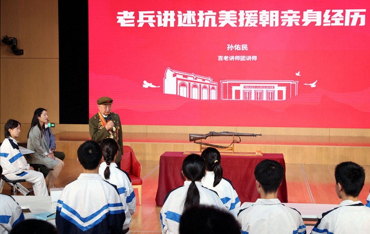 2021年10月25日,老兵代表在上海中學(xué)的課堂上講述抗美援朝的親身經(jīng)歷。這堂特別的思政課是中共一大紀(jì)念館“百物進(jìn)百校,百講證百年”活動的第一講,紀(jì)念館從館藏中精選100件革命文物,帶進(jìn)學(xué)校課堂,以“文物進(jìn)校園”的形式,用好用活紅色資源,賡續(xù)紅色血脈。
