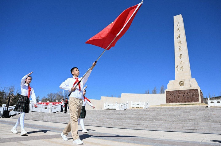 這是2025年4月2日在內(nèi)蒙古呼和浩特市大青山紅色文化公園拍攝的中國少年先鋒隊出旗儀式。