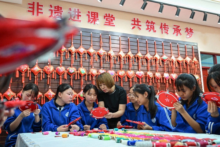 2025年9月26日,內(nèi)蒙古興安盟科右中旗巴彥呼舒第六中學(xué)美術(shù)教師、非遺代表性傳承人吳斯琴(左四)指導(dǎo)學(xué)生刺繡。近年來,內(nèi)蒙古興安盟科爾沁右翼中旗巴彥呼舒第六中學(xué)將當(dāng)?shù)貒壹壏沁z圖什業(yè)圖刺繡引入校園,開設(shè)校本課程,并成立興趣社團(tuán),在豐富校園文化生活的同時,讓學(xué)生們近距離感受非遺的魅力,弘揚(yáng)和傳承中華優(yōu)秀傳統(tǒng)文化。