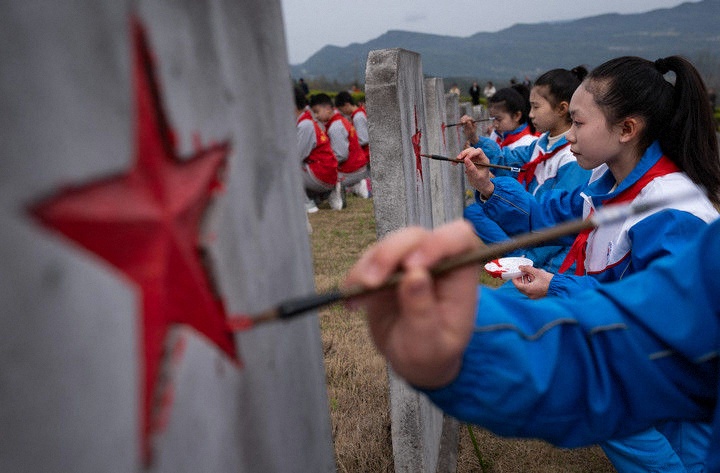 2025年3月31日,在四川川陜革命根據(jù)地紅軍烈士陵園,紅軍小學(xué)學(xué)生為無名烈士墓碑上的五角星描紅。當(dāng)日,來自四川通江縣的300名中小學(xué)青少年代表,齊聚川陜革命根據(jù)地紅軍烈士陵園,在莊嚴(yán)肅穆的儀式中開啟了一堂“紀(jì)念碑下的思政課”,為埋葬在這里的25048名紅軍烈士寄去哀思。