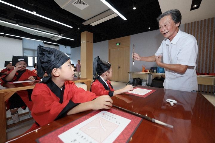 2024年8月28日,浙江寧波市中城小學(xué)的教師帶領(lǐng)參加開學(xué)禮的一年級新生朗誦三字經(jīng)。中城小學(xué)從2008年開始在孔廟內(nèi)舉辦傳統(tǒng)開學(xué)禮,并將其作為學(xué)校禮儀教育的一節(jié)課程,希望通過這種傳統(tǒng)且有特色的開學(xué)禮,讓新入學(xué)的一年級學(xué)生感受中華優(yōu)秀傳統(tǒng)文化,為他們留下記憶深刻的開學(xué)第一課。