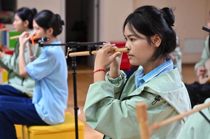 2025年6月12日,海南省民族技工學(xué)校學(xué)生在練習(xí)黎族鼻簫。近年來,海南省五指山市打造“非遺進(jìn)校園”工程,在14所公辦中小學(xué)開設(shè)非遺課程,培養(yǎng)青少年對中華優(yōu)秀傳統(tǒng)文化的熱愛,助力非遺傳承與發(fā)展。
