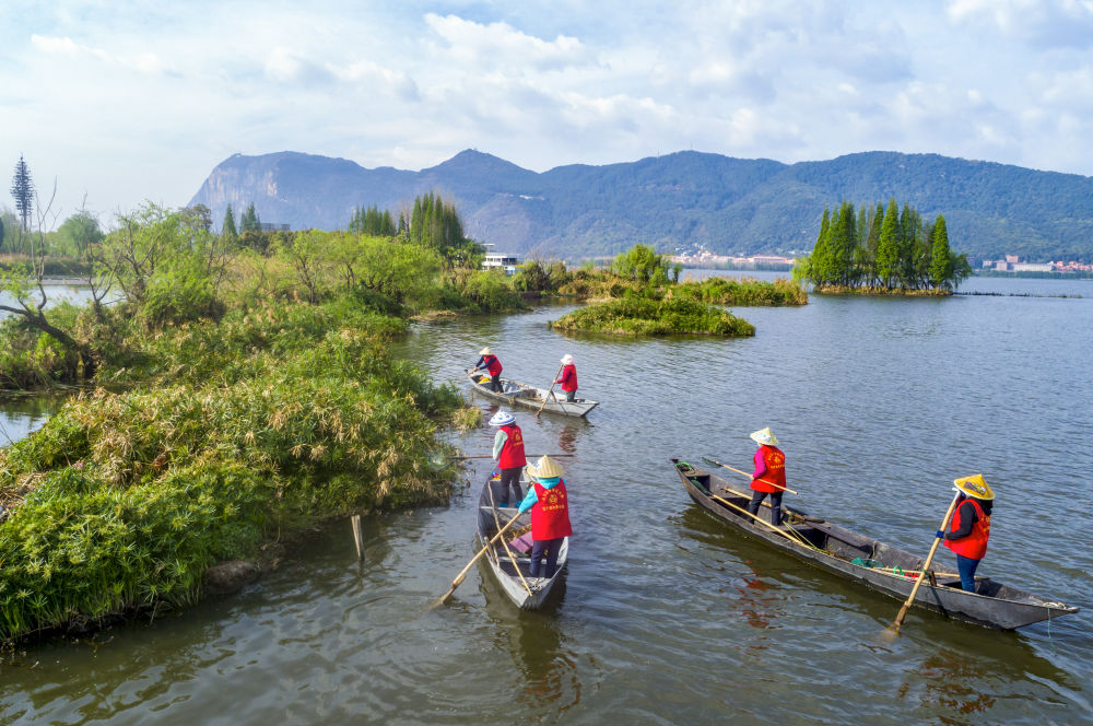 2023年3月20日,巾幗打撈隊(duì)隊(duì)員在云南昆明滇池草海打撈水草(無(wú)人機(jī)照片)。在云南昆明滇池邊,活躍著一支由當(dāng)?shù)貗D女組成的巾幗打撈隊(duì)。數(shù)十年來(lái),她們駕駛船只打撈滇池及周邊入湖河道、濕地的垃圾、雜草等。