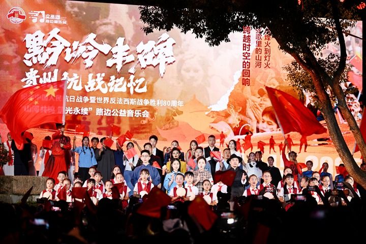 這是在貴陽市云巖區(qū)文昌閣日晷廣場舉辦的主題為“黔嶺豐碑 貴州抗戰(zhàn)記憶”的路邊公益音樂會(2025年8月22日攝)。新華社發(fā)