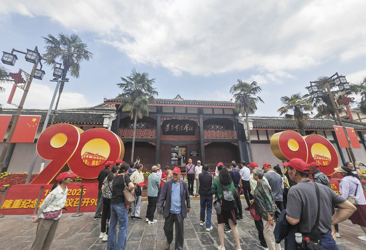 人們在遵義會議會址門前參觀、留影(2025年5月13日攝)。新華社記者 李驚亞 攝