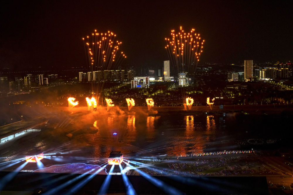 2025年8月7日在成都拍攝的第12屆世界運(yùn)動(dòng)會(huì)開(kāi)幕式上的焰火表演。焰火中的“成都”來(lái)自青銅器上的篆書(shū)銘文。通過(guò)現(xiàn)代科技的煙火表演,將古蜀文明展示給全世界觀(guān)眾。
