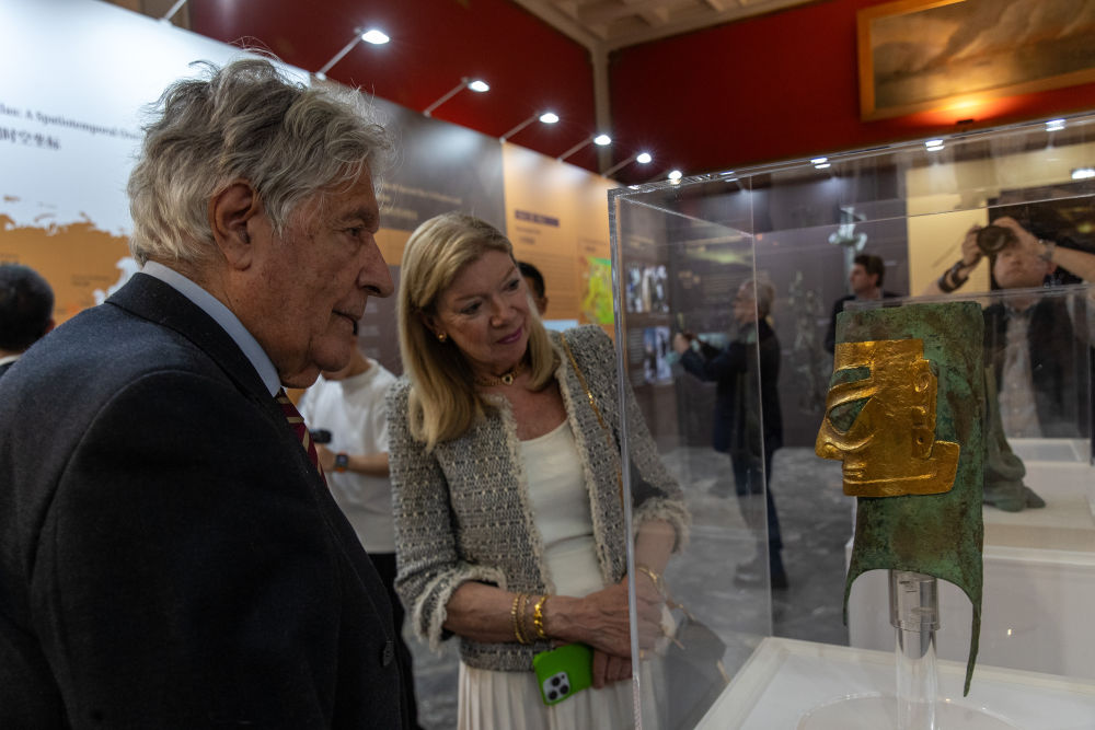 2025年5月13日,觀(guān)眾在希臘雅典新斯米爾尼市政博物館參觀(guān)“青銅之光——古蜀文明特展”。展覽通過(guò)精美的文物復(fù)制品、3D打印技術(shù)和圖文展示,生動(dòng)呈現(xiàn)以三星堆—金沙遺址為代表的古蜀文明,吸引眾多當(dāng)?shù)孛癖娗皝?lái)參觀(guān)。
