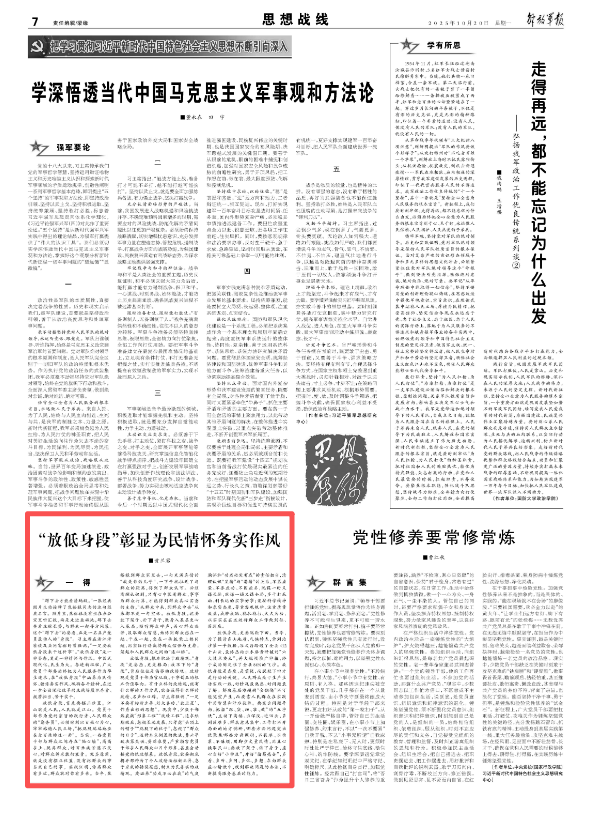 “蹲下去才能看清螞蟻。”一張經(jīng)典照片生動(dòng)詮釋了焦裕祿同志的這句經(jīng)典名言。照片里,焦裕祿沒有坐在辦公室里聽匯報(bào),而是走進(jìn)鹽堿地,蹲下去查看莊稼長(zhǎng)勢(shì),與群眾一起尋方問策。這個(gè)“蹲下去”的姿態(tài),正是一名共產(chǎn)黨員最動(dòng)人的“身段”。習(xí)主席在浙江考察談及共同富裕時(shí)曾強(qiáng)調(diào),“一定要放低身段來干這件事”。“放低身段”是一種姿態(tài),更是一種情懷與作風(fēng)。中國式現(xiàn)代化,民生為大。奮進(jìn)新征程,廣大黨員干部要始終把為人民服務(wù)作為畢生追求,在“放低身段”中涵養(yǎng)為民情懷、錘煉務(wù)實(shí)作風(fēng)、砥礪奮斗精神,在進(jìn)一步全面深化改革的主戰(zhàn)場(chǎng)履職盡責(zé)、挺膺擔(dān)當(dāng)、苦干實(shí)干。