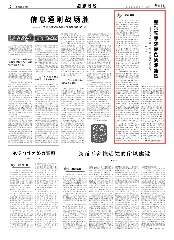 要以“事”為基,深扎理論之根?!笆隆奔纯陀^存在的實際情況,是全部工作的出發(fā)點,但倘若不掌握科學理論的“望遠鏡”和“顯微鏡”,便無法穿透迷霧掌握實際情況?!按蚶务R克思主義理論功底,這是堅持實事求是的理論基礎?!遍_展軍隊政治工作,必須將黨的創(chuàng)新理論武裝作為首要任務,引導官兵深入學習貫徹習近平新時代中國特色社會主義思想,突出學好習近平強軍思想,在學思踐悟中科學把握事物本質和發(fā)展規(guī)律,任何時候任何情況下都保持清醒頭腦、把準前進方向。以“求”為徑,大興調研之風?!扒蟆奔刺剿鳌⒀芯?,是從“實事”到“是”的橋梁。調查研究是堅持實事求是思想路線的基本途徑和基礎性環(huán)節(jié),也是我黨我軍的優(yōu)良傳統(tǒng)。弘揚實事求是的優(yōu)良傳統(tǒng),就要在全軍大興調查研究之風,不斷在追根溯源中求“深”、在去偽存真中求“實”、在抽絲剝繭中求“細”、在見微知著中求“準”、在久久為功中求“效”,努力掌握全面、真實、生動的第一手材料,真正發(fā)揮好調查研究的作用。以“實”為要,永葆黨性之純。堅持從實際出發(fā)、實事求是,不只是思想方法問題,也是黨性強不強的問題。軍隊黨員干部要加強黨性修養(yǎng),培塑正確政績觀、事業(yè)觀、權力觀,始終保持知重負重的膽氣、攻堅克難的勇氣、爭創(chuàng)一流的銳氣,以“不馳于空想,不騖于虛聲”的實干擔當奮進新征程、建功新時代。