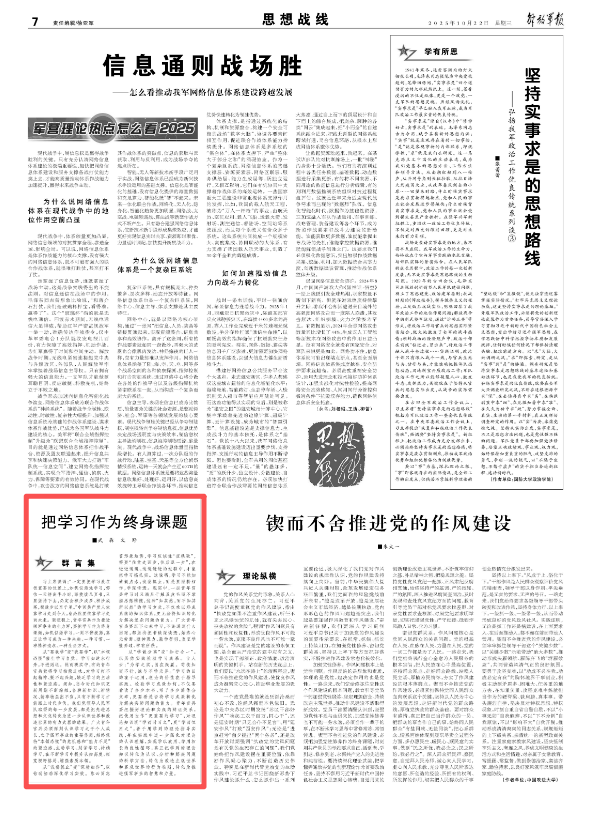 習(xí)主席強調(diào):“一定要把學(xué)習(xí)放在很重要的位置上,如饑似渴地學(xué)習(xí),哪怕一天擠出半小時,即使讀幾頁書,只要堅持下去,必定會積少成多、積沙成塔,積跬步以至千里。”中國共產(chǎn)黨人依靠學(xué)習(xí)走到今天,也必然要依靠學(xué)習(xí)走向未來。新征程上,青年官兵作為推進強軍事業(yè)的生力軍,要把學(xué)習(xí)作為終身課題,如饑似渴學(xué)習(xí),一刻不停提高,真正讓學(xué)習(xí)成為一種興趣、一種習(xí)慣、一種精神追求、一種生活方式。