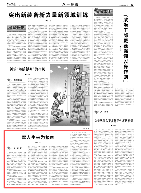 強(qiáng)國(guó)必須強(qiáng)軍,軍強(qiáng)才能國(guó)安。每名新時(shí)代軍人都應(yīng)將強(qiáng)國(guó)之志化為報(bào)國(guó)之行,愛(ài)黨忠誠(chéng)、愛(ài)國(guó)奉獻(xiàn)、愛(ài)軍精武、愛(ài)崗敬業(yè),不斷提高打贏能力,讓軍魂永駐,讓國(guó)威長(zhǎng)存。