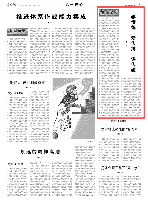 學(xué)傳統(tǒng)、愛(ài)傳統(tǒng)、講傳統(tǒng),三者緊密聯(lián)系、相輔相成,是一個(gè)有機(jī)整體。學(xué)傳統(tǒng)是基礎(chǔ),為愛(ài)傳統(tǒng)、講傳統(tǒng)指明了正確方向;愛(ài)傳統(tǒng)是動(dòng)力,為學(xué)傳統(tǒng)、講傳統(tǒng)提供了力量源泉;講傳統(tǒng)是路徑,是學(xué)傳統(tǒng)、愛(ài)傳統(tǒng)的具體實(shí)踐。當(dāng)前,我軍政治整訓(xùn)縱深推進(jìn),更加需要發(fā)揮光榮傳統(tǒng)和優(yōu)良作風(fēng)激濁揚(yáng)清、扶正祛邪的功能作用,推動(dòng)政治上的正本清源走深走實(shí)。各級(jí)黨組織應(yīng)把“學(xué)傳統(tǒng)、愛(ài)傳統(tǒng)、講傳統(tǒng)”作為一項(xiàng)系統(tǒng)工程來(lái)抓,作為純凈政治生態(tài)、鞏固純潔光榮的銳利武器,進(jìn)一步充盈正氣、固本培元,進(jìn)一步立起新風(fēng)尚、展示新氣象,確保我軍血脈永續(xù)、根基永固、優(yōu)勢(shì)永存。
