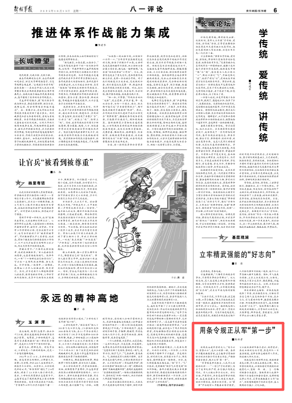 新戰(zhàn)友邁進(jìn)軍營(yíng)的大門,“有令必行、有禁必止”,是必上的第一課。各單位開展新兵教育時(shí),應(yīng)當(dāng)把學(xué)習(xí)貫徹新修訂的共同條令作為重點(diǎn)內(nèi)容,嚴(yán)格按照條令要求,規(guī)正從軍“第一步”。