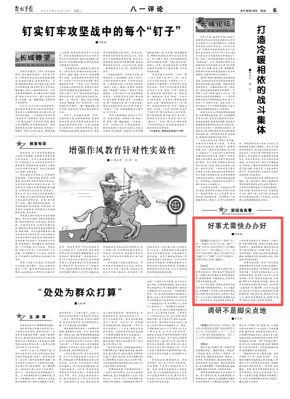 好事何需多磨?領(lǐng)導(dǎo)干部和機(jī)關(guān)要想把好事快辦辦好,就要從思想根子上解決好為誰服務(wù)、為何服務(wù)、怎樣服務(wù)的問題。多把官兵冷暖放在心上,不因事煩而畏難、不因事小而不為,以“高效辦成一件事”的態(tài)度多想辦法、多跑腿,事情總會(huì)有轉(zhuǎn)機(jī)、有結(jié)果。因此,領(lǐng)導(dǎo)干部和機(jī)關(guān)要多換位思考,不以所謂“業(yè)務(wù)權(quán)限”為“擋箭牌”,而是以馬上就辦、真抓實(shí)干的態(tài)度,以真抓的實(shí)勁、敢抓的狠勁、善抓的巧勁,把官兵呼聲放心上、把官兵需要落手上,提供“好辦事”的便利,提高“辦好事”的效率。