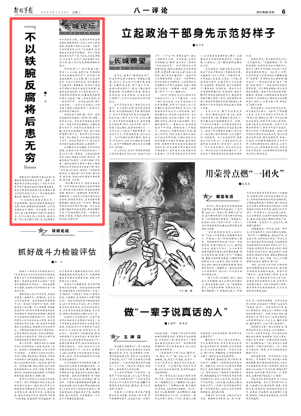 腐敗是戰(zhàn)斗力的“第一殺手”,是軍中最致命的污染源。“腐”和“敗”就像一對孿生兄弟。軍隊容忍腐敗就是容忍失敗。歷史上多少鐵騎勁旅,沒有敗給強(qiáng)大的對手,卻被燈紅酒綠迷離了雙眼,被文恬武嬉搞垮了斗志,被和平積弊消解了戰(zhàn)斗力。正如習(xí)主席的鄭重告誡:“軍隊腐敗了,這個軍隊就沒有戰(zhàn)斗力了。軍隊沒有戰(zhàn)斗力了,我們這個國家就可能要出現(xiàn)危險,沒有保障?!?/p>