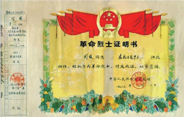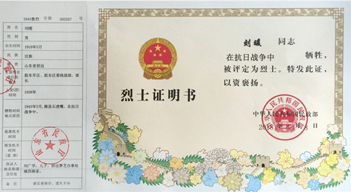 ▲2018年6月8日,經(jīng)逐級審核上報,補(bǔ)充完善還原劉暖烈士職務(wù)信息后,國家民政部換發(fā)的烈士證明書。