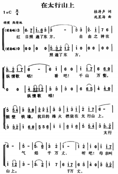 1938年6月下旬,桂濤聲回到武漢,富有鼓動(dòng)性、戰(zhàn)斗性的抗日歌曲《在太行山上》的歌詞已醞釀成熟。南太行赭紅色絕壁從華北平原拔地而起的雄姿,以及縈繞其間決死抵抗的洶涌民情,通過(guò)他滾燙的歌詞,如同狼煙烽火,瞬間點(diǎn)燃了冼星海的澎湃激情。武昌曇華林國(guó)民政府軍事委員會(huì)政治部第三廳駐地,在借來(lái)的一架鋼琴上,歌詞插上了音樂(lè)的翅膀。“紅日照遍了東方,自由之神在縱情歌唱!看吧!千山萬(wàn)壑,銅壁鐵墻,抗日的烽火燃燒在太行山上,氣焰千萬(wàn)丈,聽(tīng)吧!母親叫兒打東洋,妻子送郎上戰(zhàn)場(chǎng)。我們?cè)谔猩缴希覀冊(cè)谔猩缴?,山高林又密,兵?qiáng)馬又壯。敵人從哪里進(jìn)攻,我們就要他在哪里滅亡!敵人從哪里進(jìn)攻,我們就要他在哪里滅亡!”