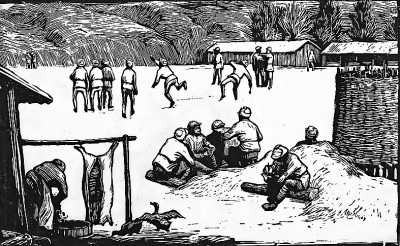 1943年秋,古元隨魯藝慰問團(tuán)赴南泥灣三五九旅駐地采風(fēng)。此時南泥灣因“自己動手、豐衣足食”的大生產(chǎn)運動成為邊區(qū)模范,部隊“一手持槍、一手務(wù)農(nóng)”的生存模式,成為重點宣傳的典型。古元目睹士兵秋收、練兵、學(xué)習(xí)的場景,產(chǎn)生強(qiáng)烈創(chuàng)作欲望,于是完成了《練兵》這件作品。畫面描繪了軍營前的操場上,士兵有的在訓(xùn)練投擲手榴彈,有的圍坐在一起學(xué)習(xí)討論,還有的在筆記本上做筆記。畫面左下角有炊事員在忙碌,木架上吊著剛宰殺好的豬,旁邊有雞鴨等家禽。遠(yuǎn)處有一排排整齊的營房,兩位首長模樣的人在交談。畫面簡潔明朗、清新自然,正像古元自比的那樣,這是“從人民生活的泉水中釀造出精神的甜蜜”。延安《解放日報》于1943年11月17日刊載了這幅作品,南泥灣精神通過木刻藝術(shù)形式傳播開來。