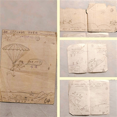 ▲美國(guó)飛行員克爾在煙盒背面畫的連環(huán)漫畫。
