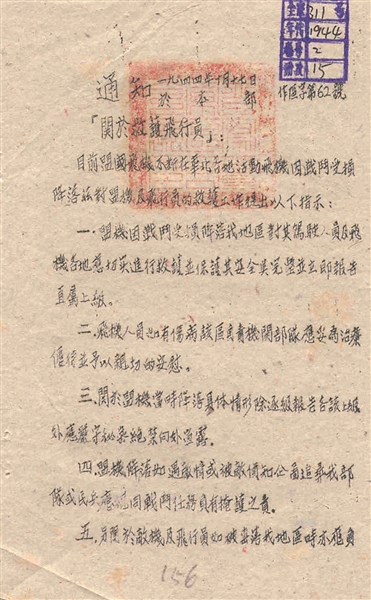 五、另關(guān)于敵機(jī)及飛行員如被擊落我地區(qū)時(shí),亦應(yīng)負(fù)責(zé)救護(hù)并迅速報(bào)告上級(jí)處理,但須注意監(jiān)視防其逃脫與自殺。