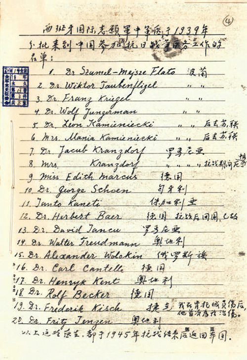 解放軍檔案館曾通過社會征集,收到一份特別的檔案,標(biāo)題是《西班牙國際志愿軍中軍醫(yī)于1939年分批來到中國參加抗日戰(zhàn)爭醫(yī)務(wù)工作的名單》。檔案記錄了20名外國軍醫(yī)名字,且都標(biāo)注了國籍。