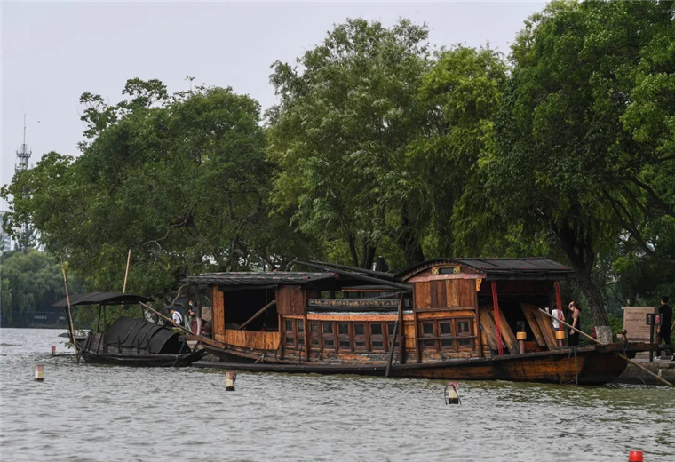 7月1日,嘉興南湖景區(qū)內(nèi)停泊的中共一大紀(jì)念船。新華社記者 徐昱 攝