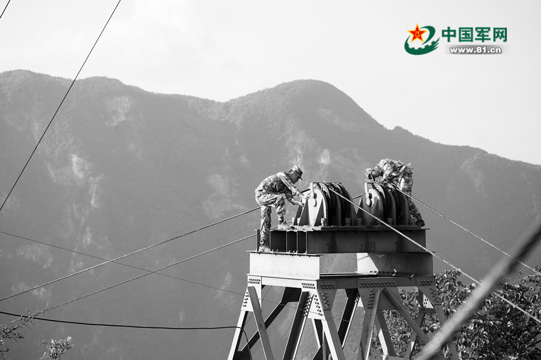 戰(zhàn)士們攀上鐵塔頂部維護(hù)線路。