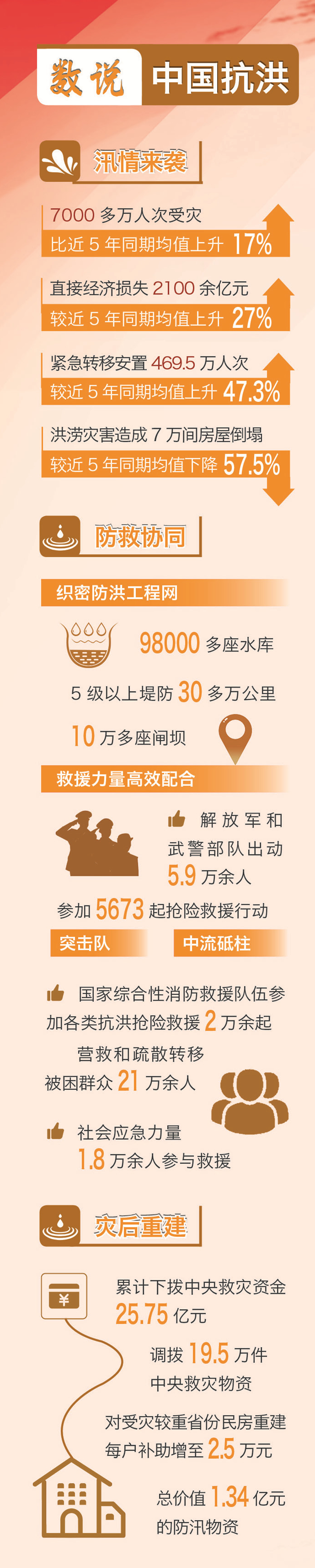全國(guó)大江大河主要堤防、重點(diǎn)地區(qū)防洪工程未發(fā)生重大險(xiǎn)情;災(zāi)情明顯偏重的情況下,全國(guó)因?yàn)?zāi)死亡失蹤人口、倒塌房屋數(shù)量較近5年同期均值分別下降49.8%和57.5%。