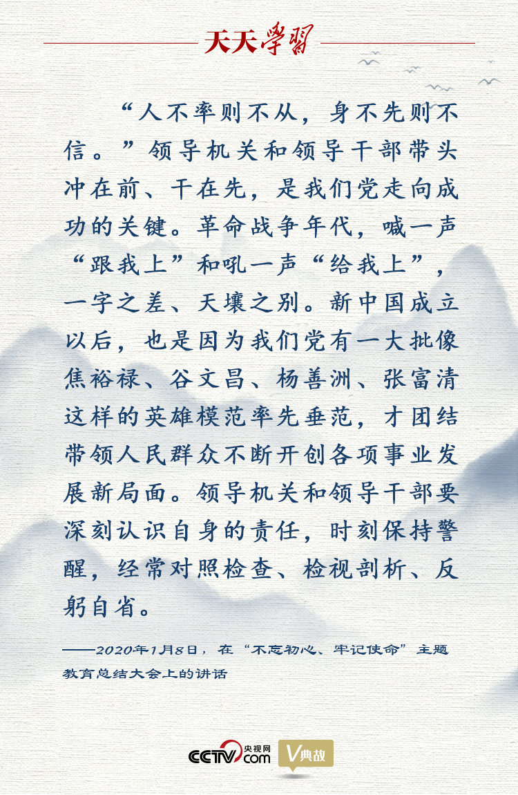 總結(jié)大會上,總書記在講到“不忘初心、牢記使命,必須堅持領(lǐng)導(dǎo)機關(guān)和領(lǐng)導(dǎo)干部帶頭”時,引用了“人不率則不從,身不先則不信”這句古語。他指出,領(lǐng)導(dǎo)機關(guān)是國家治理體系中的重要機關(guān),領(lǐng)導(dǎo)干部是黨和國家事業(yè)發(fā)展的“關(guān)鍵少數(shù)”,對全黨全社會都具有風(fēng)向標(biāo)作用。在上面要求人、在后面推動人,都不如在前面帶動人管用。領(lǐng)導(dǎo)機關(guān)和領(lǐng)導(dǎo)干部帶頭沖在前、干在先,是我們黨走向成功的關(guān)鍵。