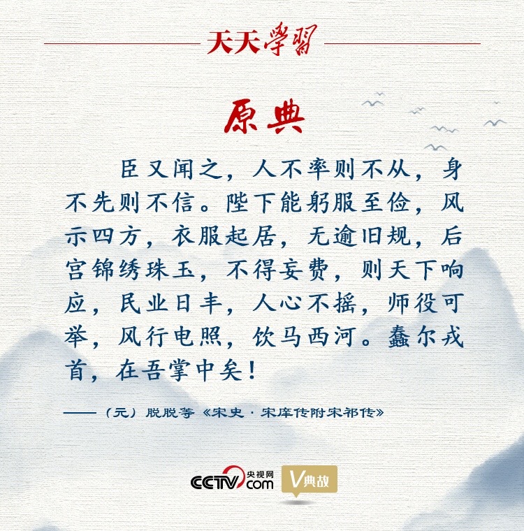 作為北宋的一代名臣,宋祁以天下為己任。寶元二年(1039年),面對西北邊境戰(zhàn)事吃緊、國家財政日益困窘的情況,宋祁向宋仁宗呈奏《上三冗三費疏》,建議“去三冗”(冗官、冗兵、冗僧)、“節(jié)三費”(道場齋醮、多建寺觀、靡費公用),直言朝廷應(yīng)該精兵簡政,節(jié)約開支,并勸諫宋仁宗從自身及后宮嬪妃做起,帶頭節(jié)儉,布告四方,這樣天下就會群起響應(yīng)。由此提出了“人不率則不從,身不先則不信”的諫言,意思是在上位的人如果自己不作表率,下面的人就不會跟從;如果自己不身先力行,下面的人就不會信服。