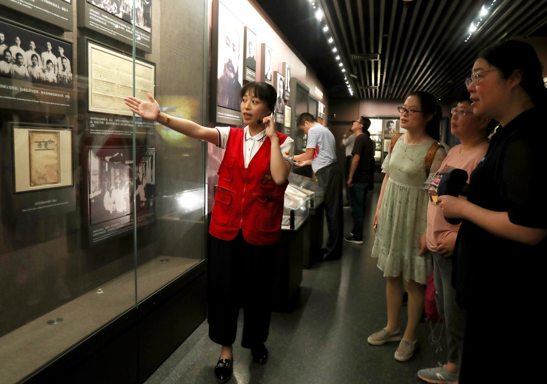 1月20日,“黨的誕生地”志愿服務(wù)隊(duì)隊(duì)員、上海大學(xué)的學(xué)生在中共一大會(huì)址紀(jì)念館為觀眾進(jìn)行講解(2019年6月22日攝)。新華社記者 劉穎 攝