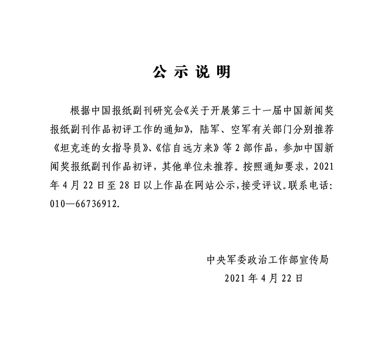 中央軍委政治工作部宣傳局第三十一屆中國新聞獎推薦參加初評作品公示(報紙副刊)
