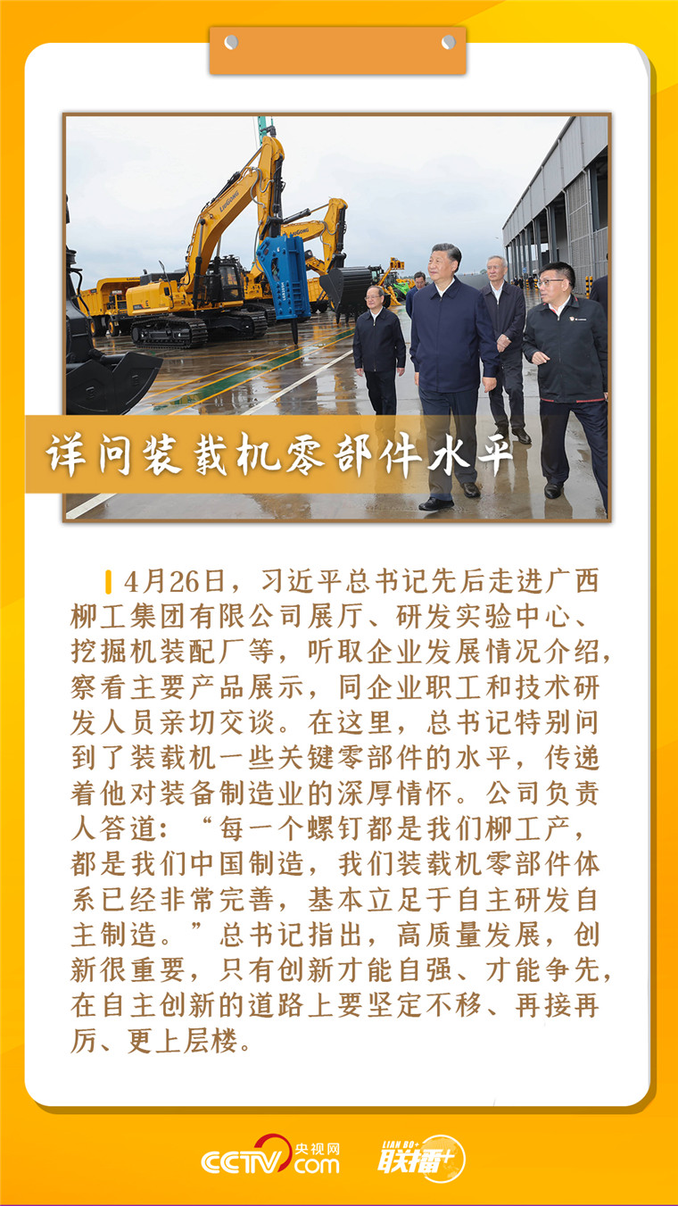 從到紅軍長(zhǎng)征湘江戰(zhàn)役紀(jì)念園向湘江戰(zhàn)役紅軍烈士敬獻(xiàn)花籃、參觀紀(jì)念館到走進(jìn)毛竹山村葡萄種植園察看葡萄長(zhǎng)勢(shì),再到走進(jìn)廣西柳工集團(tuán)有限公司展廳、研發(fā)實(shí)驗(yàn)中心等聽(tīng)取企業(yè)發(fā)展情況介紹……總書(shū)記行程滿滿,步履匆匆,留下很多令人印象深刻的話語(yǔ)與瞬間。