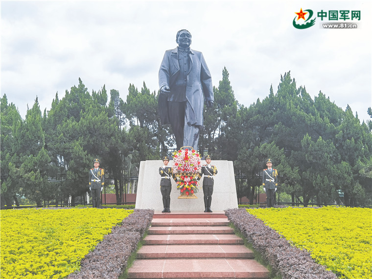 武警廣東總隊深圳支隊執(zhí)勤一中隊官兵為鄧小平銅像敬獻(xiàn)花籃。龍開寧攝