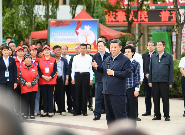 ↑2020年6月8日,習(xí)近平在寧夏吳忠市利通區(qū)金花園社區(qū)廣場(chǎng),同居民們親切交流。