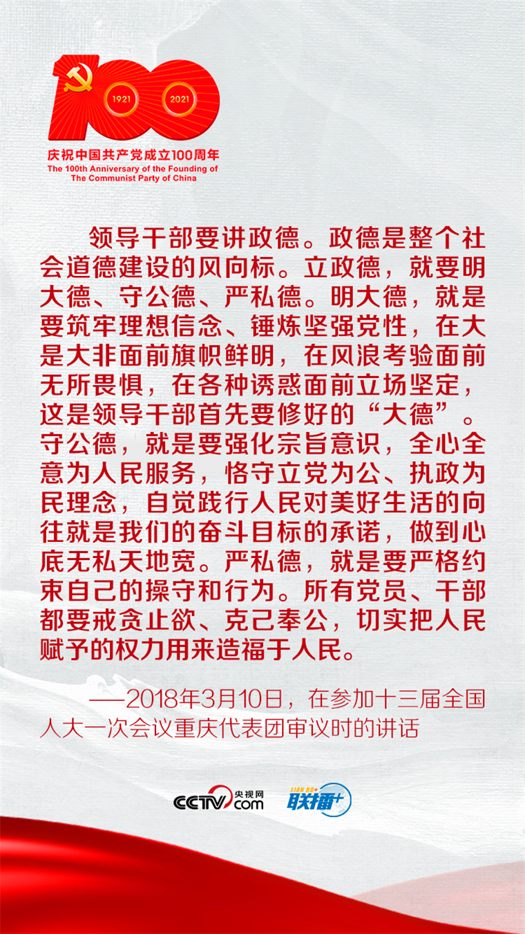 國無德不興,人無德不立。政德絕非私事、小事,而是事關(guān)黨的形象和創(chuàng)造力、凝聚力、戰(zhàn)斗力的大事、要事。央視網(wǎng)《聯(lián)播+》特梳理總書記重要講話,與您一起學習。