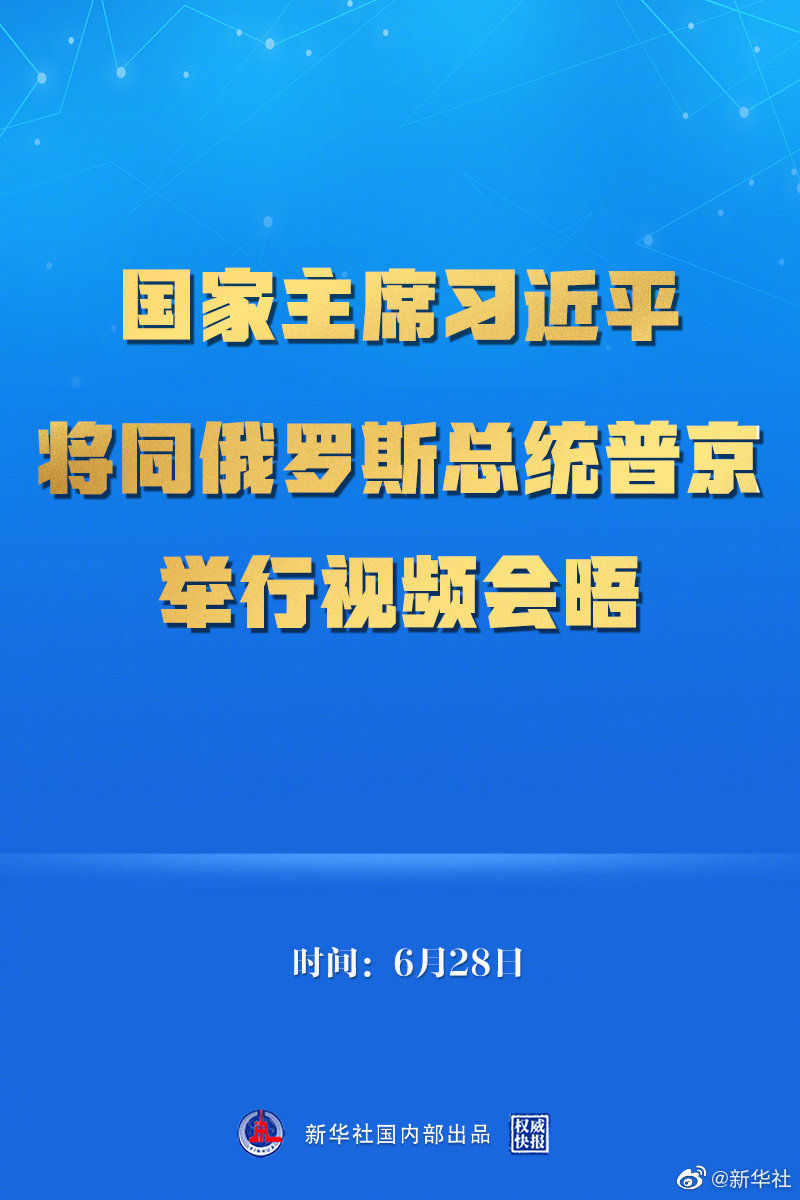 外交部發(fā)言人華春瑩6月25日宣布:國家主席習(xí)近平將于6月28日同俄羅斯聯(lián)邦總統(tǒng)普京舉行視頻會晤。