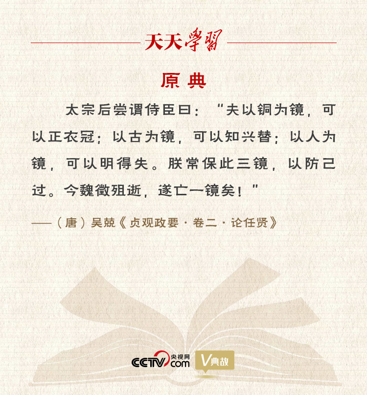 “以史為鑒,可以知興替”,最早應(yīng)出自唐代史學(xué)家吳兢的政論性史書(shū)《貞觀政要》:“夫以銅為鏡,可以正衣冠;以古為鏡,可以知興替;以人為鏡,可以明得失?!边@是唐朝第一諍臣魏徵去世后,唐太宗對(duì)朝臣發(fā)出的感慨之言?!杜f唐書(shū)·魏徵傳》抄錄此語(yǔ)。后來(lái),歐陽(yáng)修、宋祁所編《新唐書(shū)·魏徵傳》對(duì)此略作修改:“以銅為鑒,可正衣冠;以古為鑒,可知興替;以人為鑒,可明得失。”這句話的意思是,用銅作鏡子,可以端正衣冠;用歷史作鏡子,可以知道歷代興亡更替的規(guī)律;用人作鏡子,可以明了自身的得失。