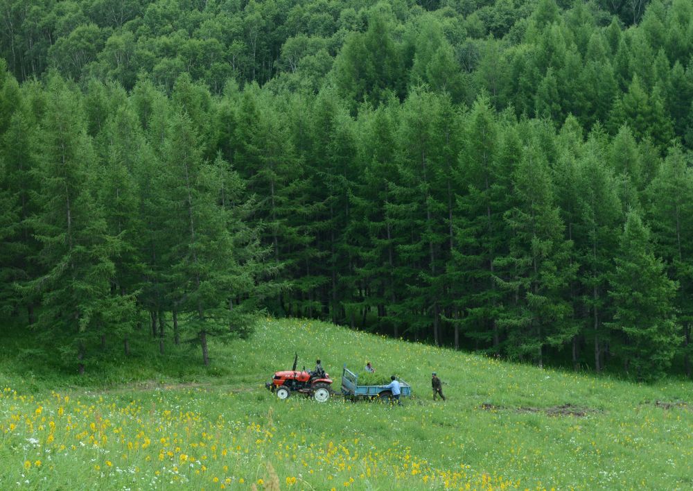 ↑工人在塞罕壩機(jī)械林場千層板林場內(nèi)運(yùn)輸苗木(2013年7月11日攝)。