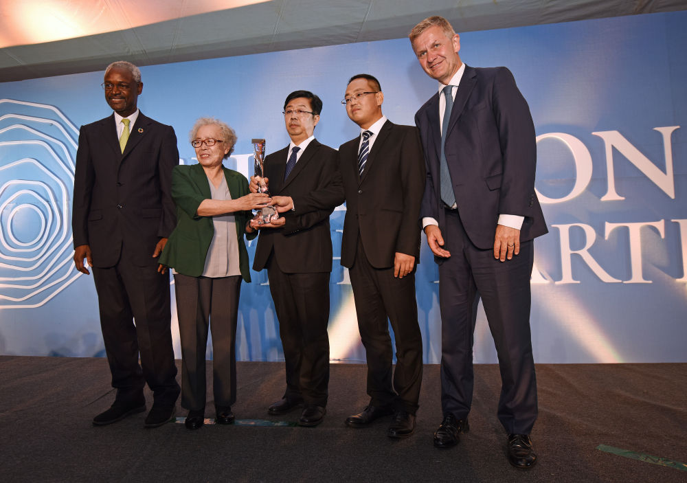 ↑在肯尼亞內(nèi)羅畢聯(lián)合國環(huán)境規(guī)劃署總部,老、中、青三位塞罕壩人陳彥嫻(左二)、劉?,摚ㄖ校?、于士濤(右二)領(lǐng)取2017年聯(lián)合國環(huán)保最高榮譽(yù)——“地球衛(wèi)士獎”(2017年12月5日攝)。