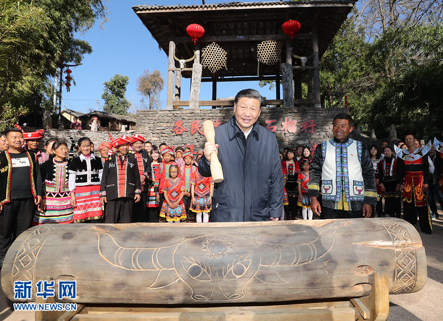 2020年1月19日至21日,中共中央總書記、國家主席、中央軍委主席習近平來到云南,看望慰問各族干部群眾,向全國人民致以新春祝福。這是19日下午,習近平在騰沖市清水鄉(xiāng)三家村中寨司莫拉佤族村廣場上,敲響三聲佤族木鼓,祝福來年風調雨順、國泰民安。 新華社記者 鞠鵬 攝