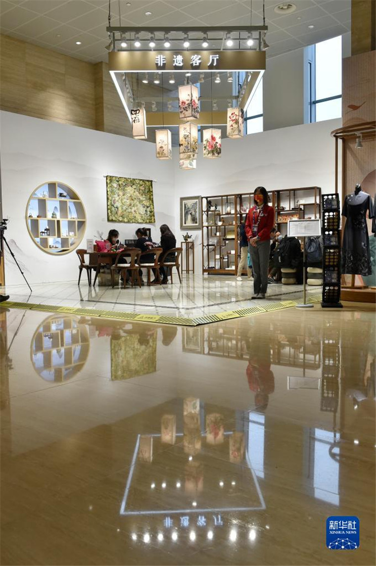 這是11月4日拍攝的第四屆進(jìn)博會(huì)新聞中心內(nèi)的非遺文化展示區(qū)。新華社記者 魯鵬 攝