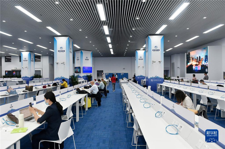 11月4日,媒體記者在第四屆進(jìn)博會(huì)新聞中心的媒體公共工作區(qū)工作。新華社記者 魯鵬 攝