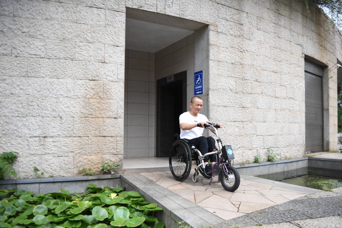 在湖南省長(zhǎng)沙市湘府文化公園,劉毅坐電動(dòng)輪椅車從無障礙洗手間出來(2021年8月25日攝)。新華社記者 薛宇舸 攝